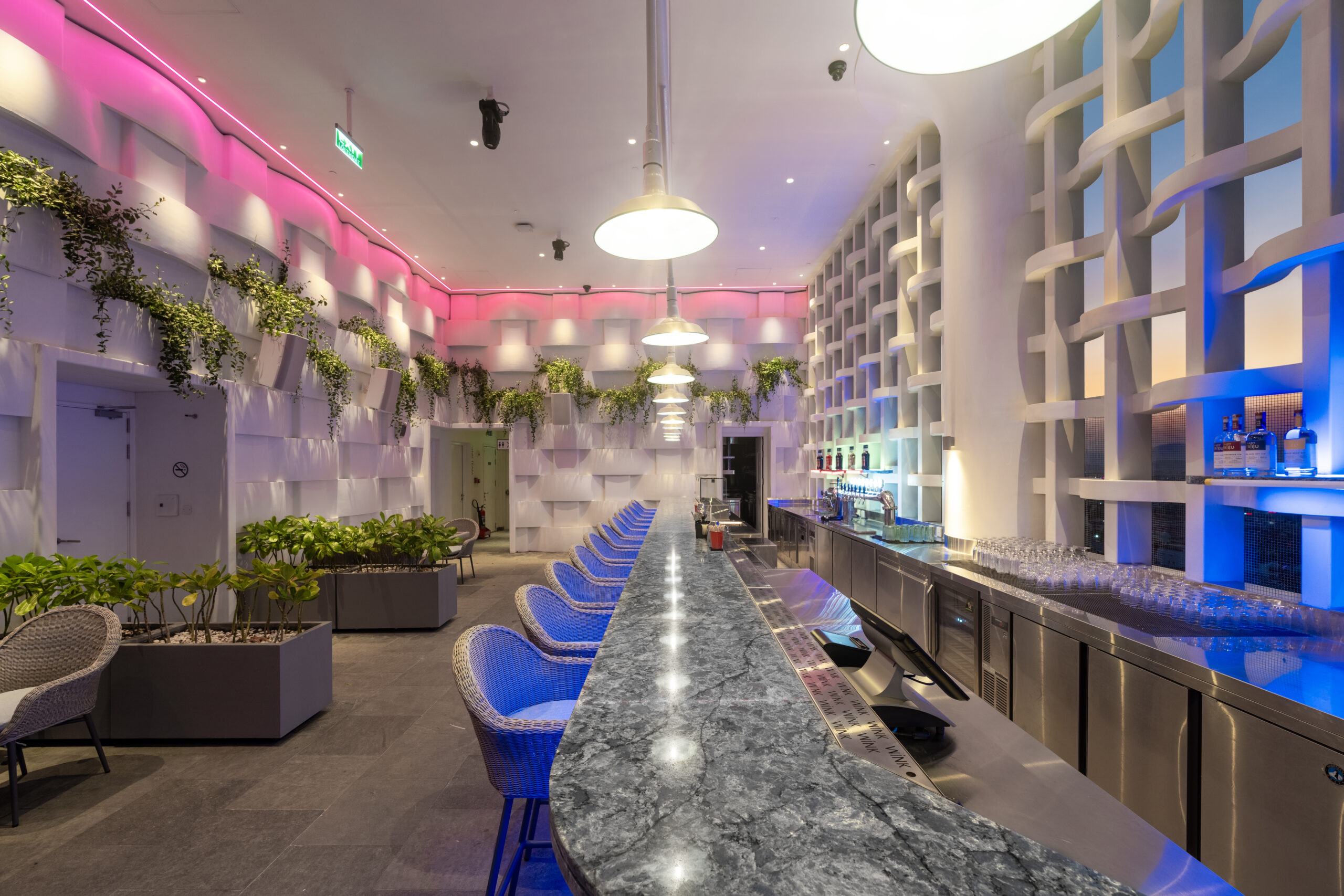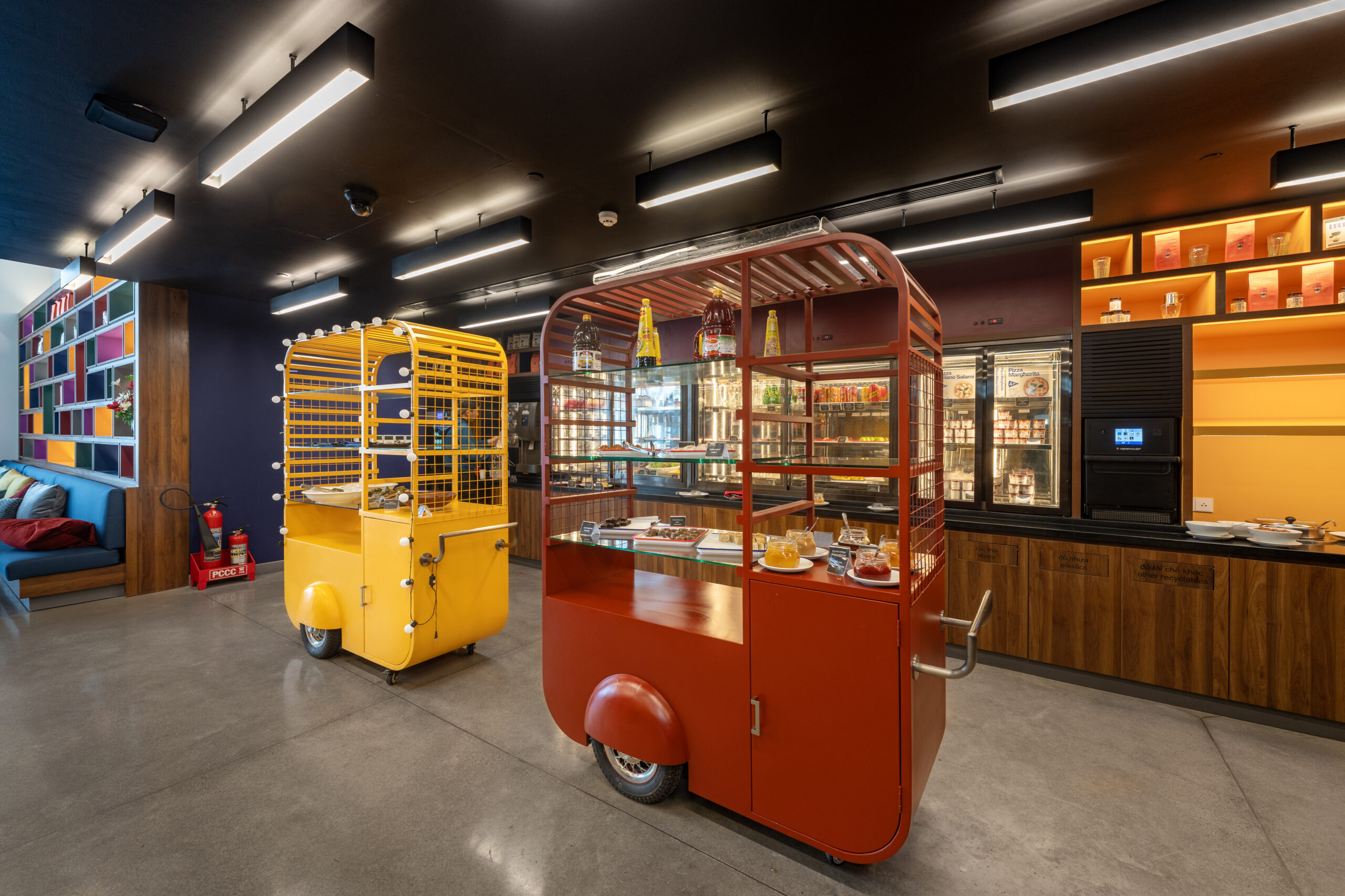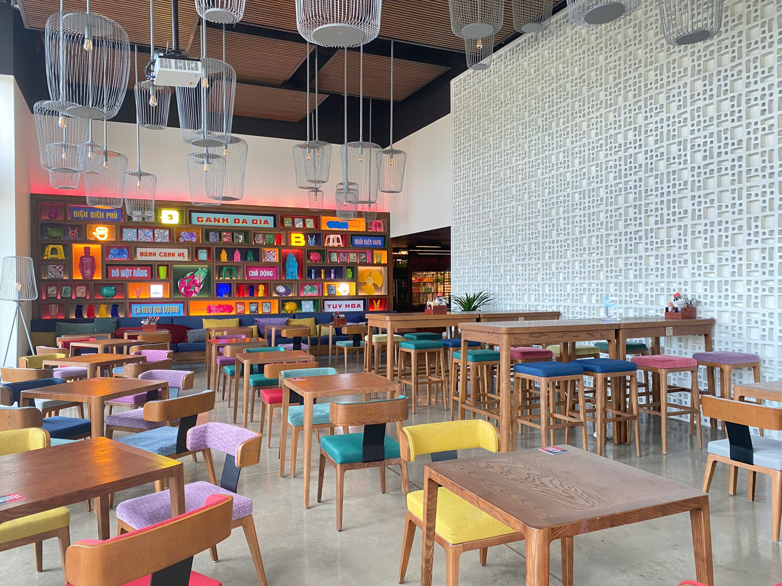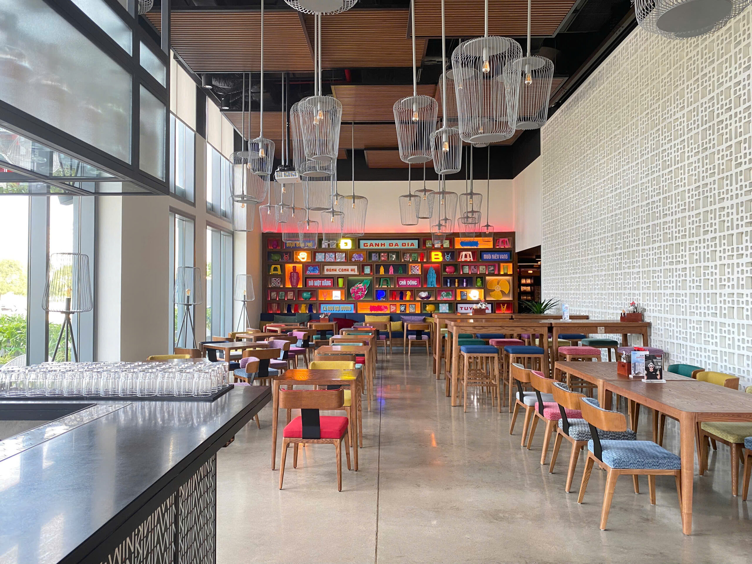 Quên đi những sảnh chờ truyền thống cứng nhắc! Vừa bước vào Wink, khách sẽ bị ấn tượng ngay bởi không gian đậm chất nghệ thuật với những gam màu nóng bỏng (cam, vàng, hồng) cực kỳ “Instagrammable”.