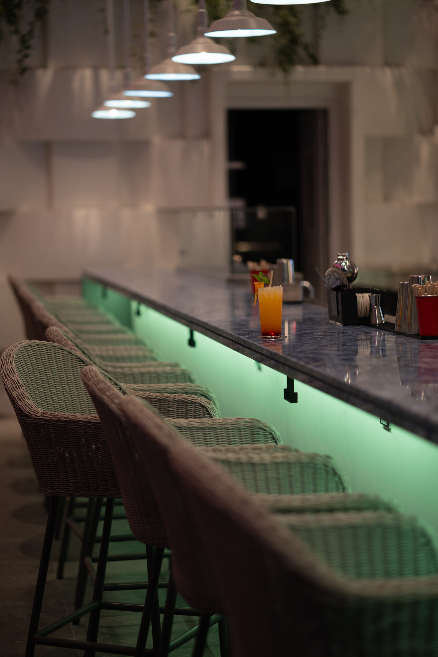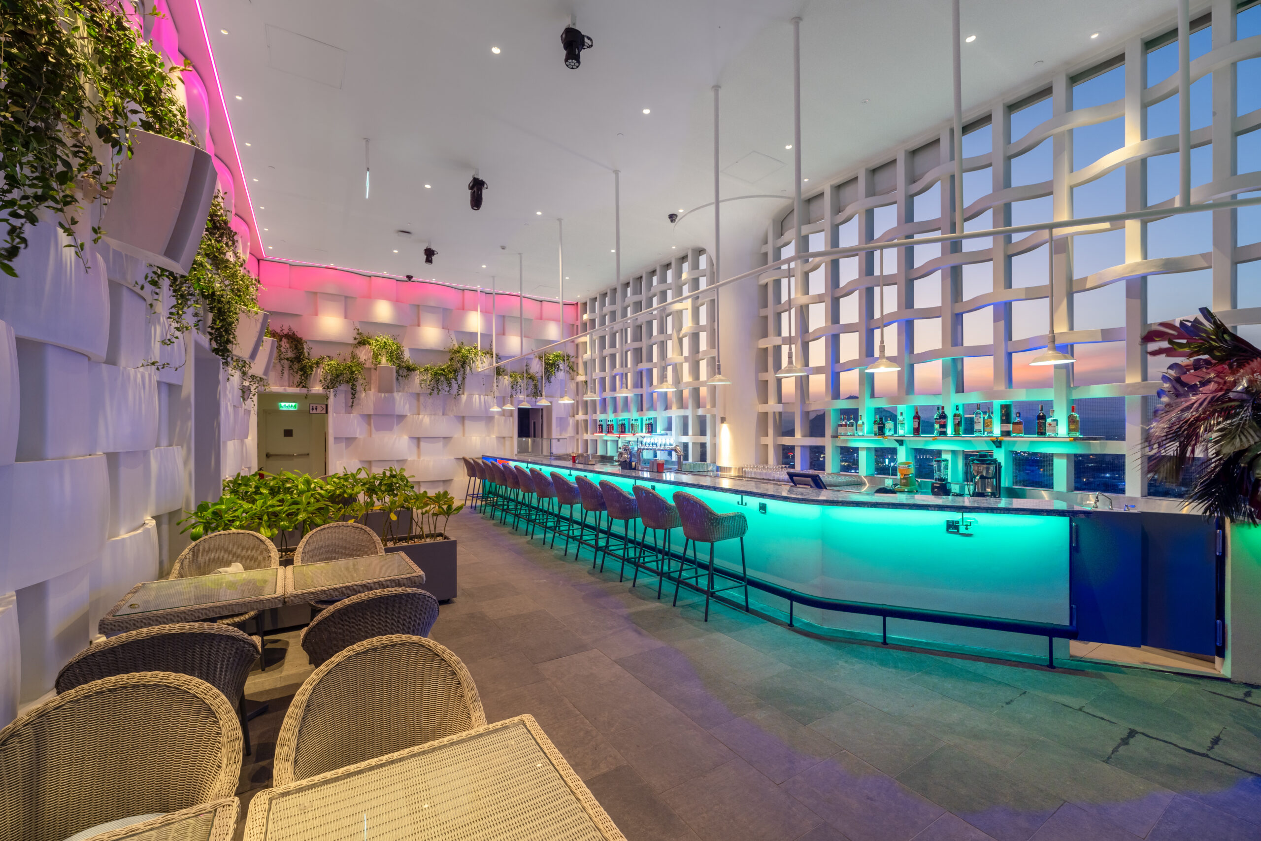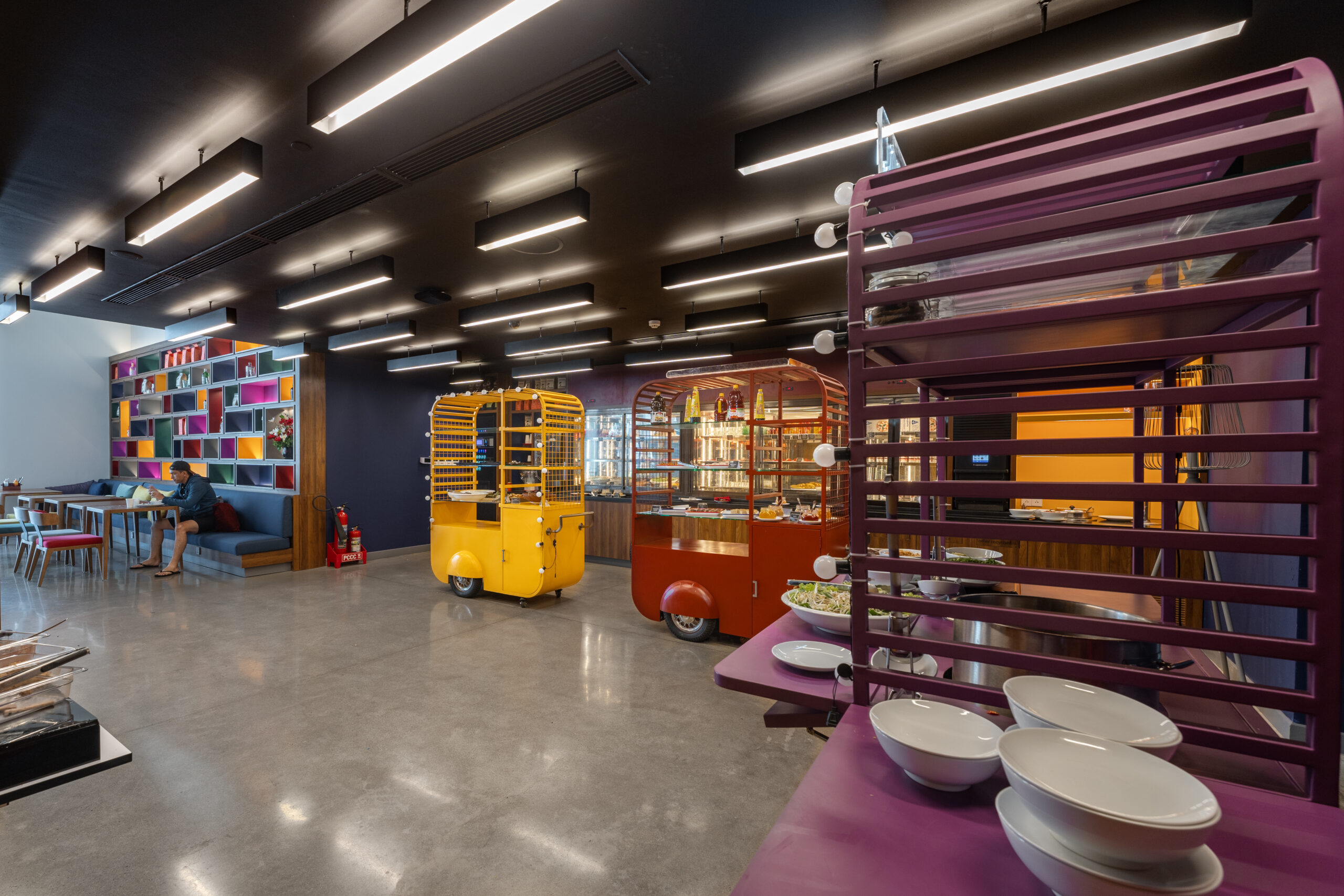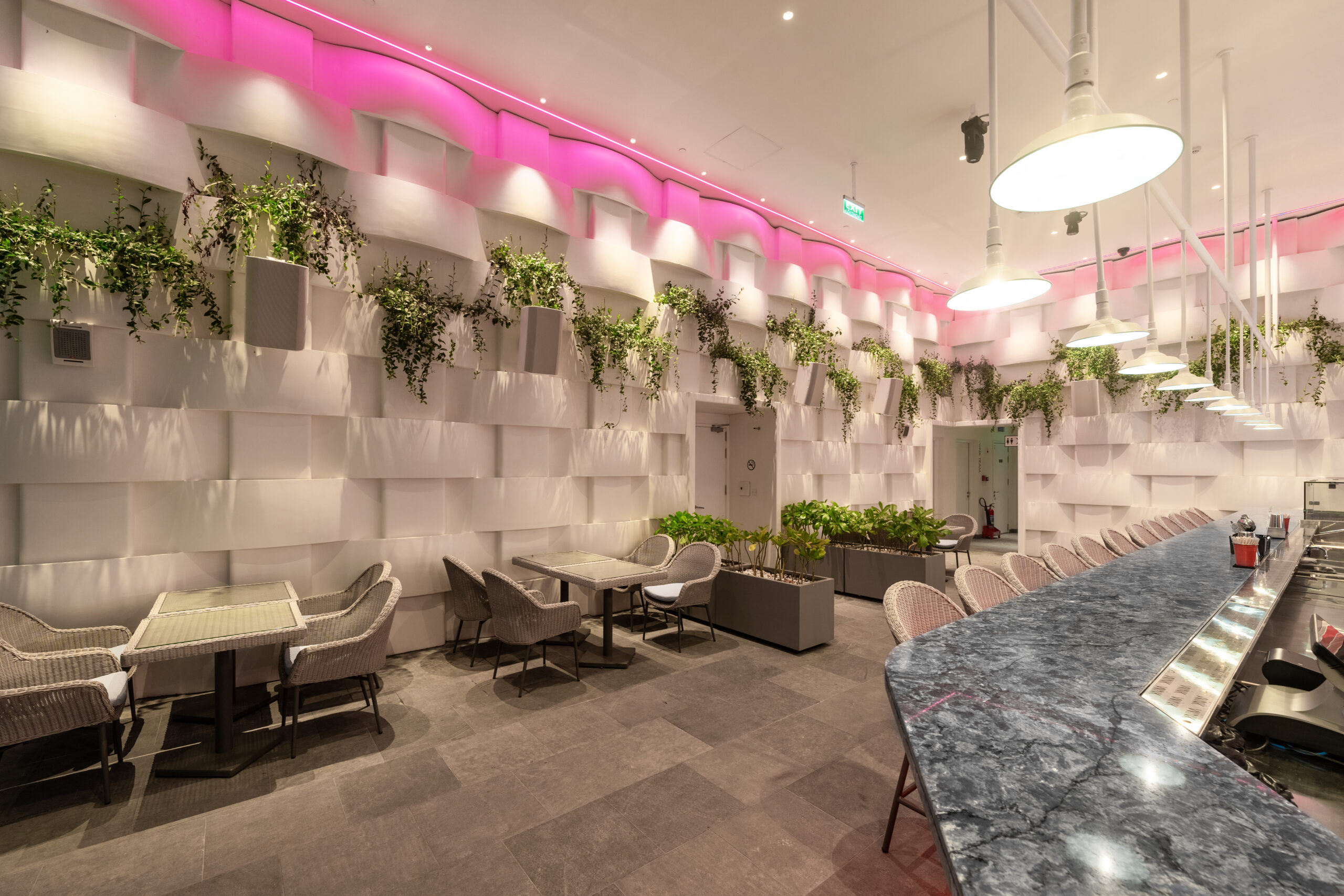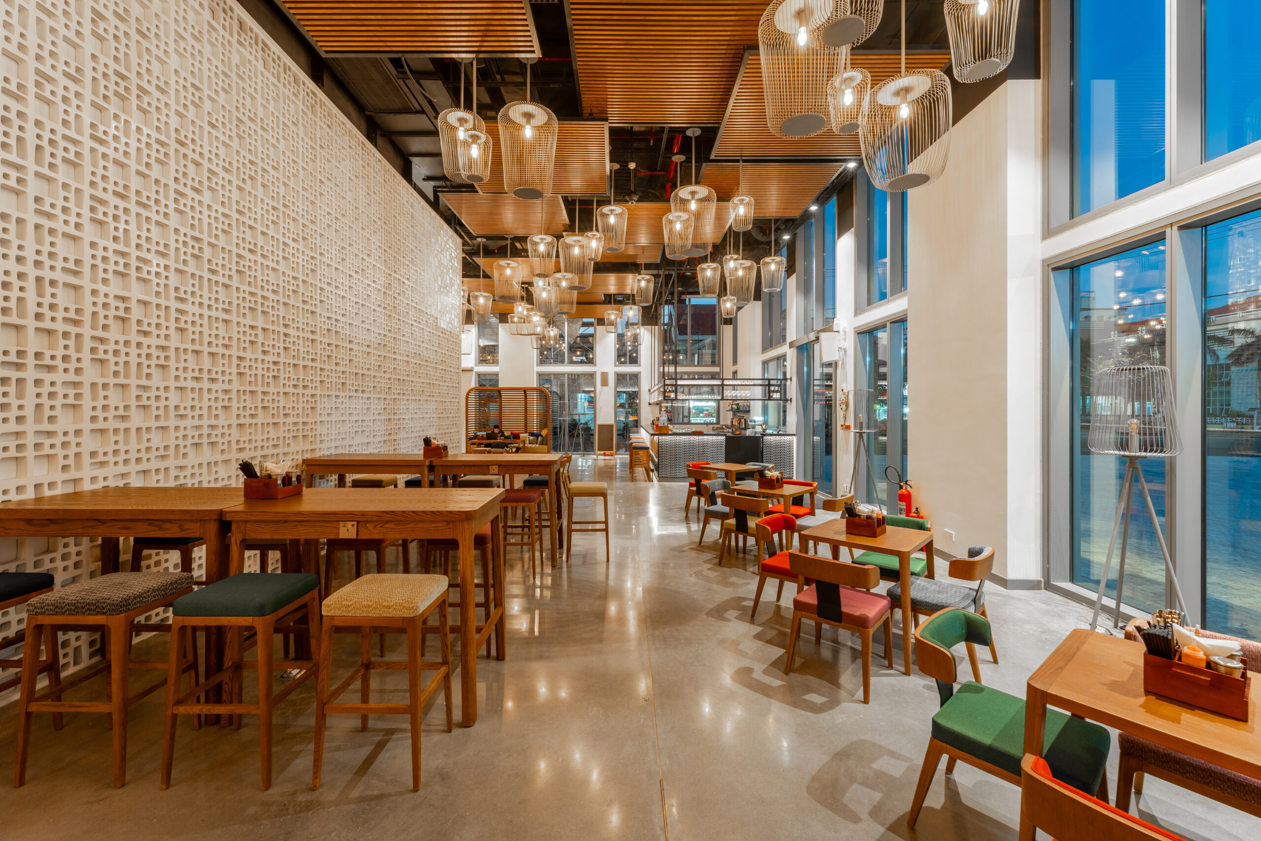 Quên đi những sảnh chờ truyền thống cứng nhắc! Vừa bước vào Wink, khách sẽ bị ấn tượng ngay bởi không gian đậm chất nghệ thuật với những gam màu nóng bỏng (cam, vàng, hồng) cực kỳ “Instagrammable”.